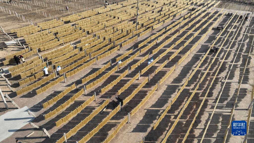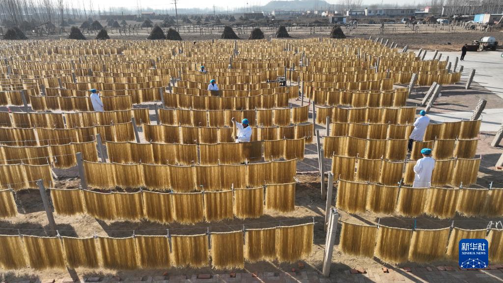12月6日,河北省遷安市夏官營鎮梁龐莊村一家粉條加工企業的工人在晾曬粉條(無人機照片)。