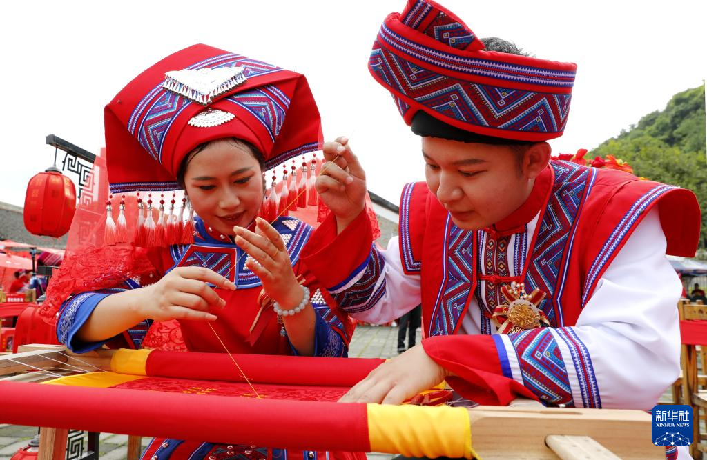 5月20日,在廣西忻城縣“520”集體婚禮現場,一對新人一起繡婚書。