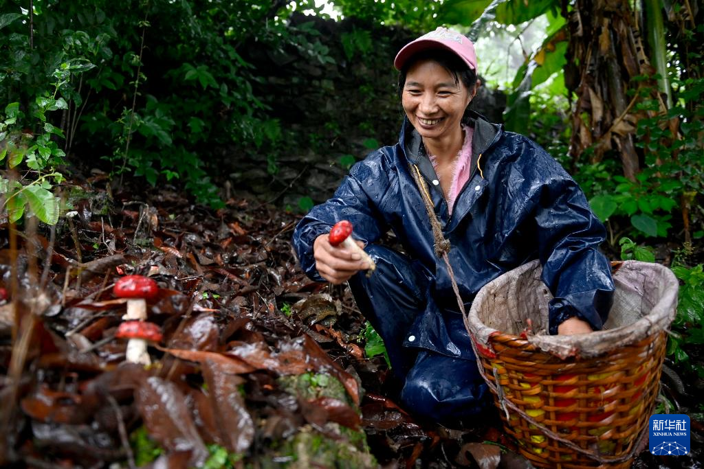 7月2日,云南省大理白族自治州南澗彝族自治縣公郎鎮村民在采摘大紅菌。