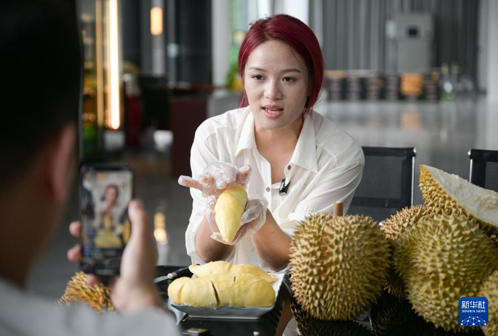 7月20日,在海南省三亞市優旗大嘴鳥榴蓮園一號基地,網絡主播在視頻直播中介紹國產榴蓮。