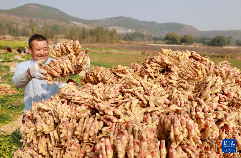 10月30日,山東省棗莊市市中區稅郭鎮農民在生姜種植基地收獲生姜。