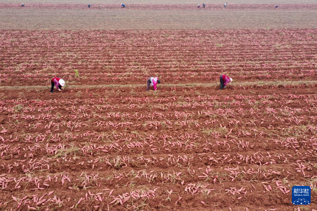 10月30日,在河南省沁陽市王曲鄉東王曲村一家庭農場,農民在田間收獲紅薯(無人機照片)。