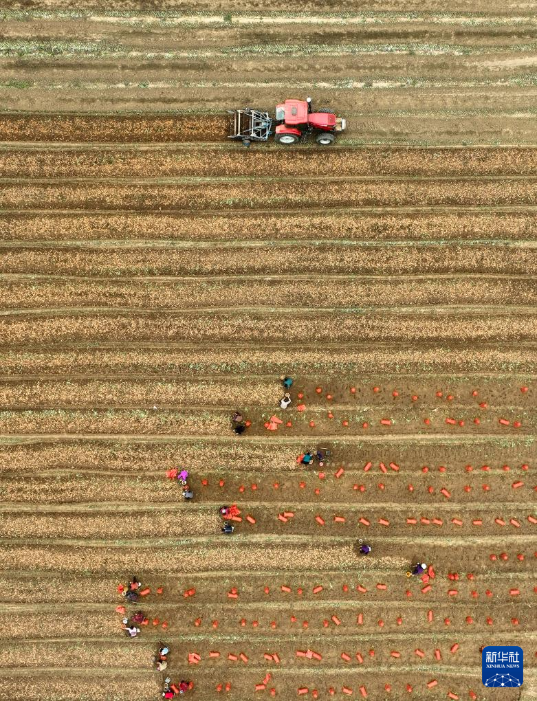 10月30日,在河北省石家莊市元氏縣殷村鎮殷村中藥材種植田,農民們忙著采收地黃(無人機照片)。