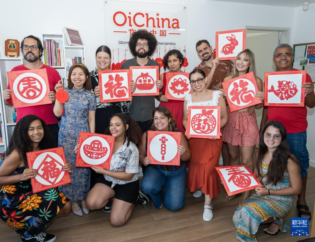 1月18日,人們?cè)诎臀骼锛s熱內(nèi)盧舉行的中國(guó)春節(jié)文化體驗(yàn)活動(dòng)上展示他們一起制作的剪紙。