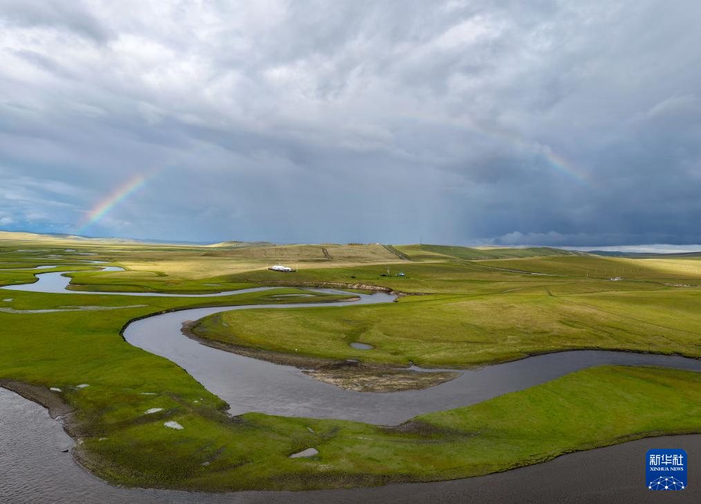 9月14日在內蒙古呼倫貝爾市陳巴爾虎旗拍攝的彩虹下的莫爾格勒河(無人機照片)。