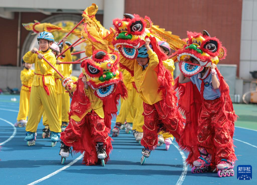 9月29日,在山東省榮成市實驗小學,孩子們表演舞龍舞獅。