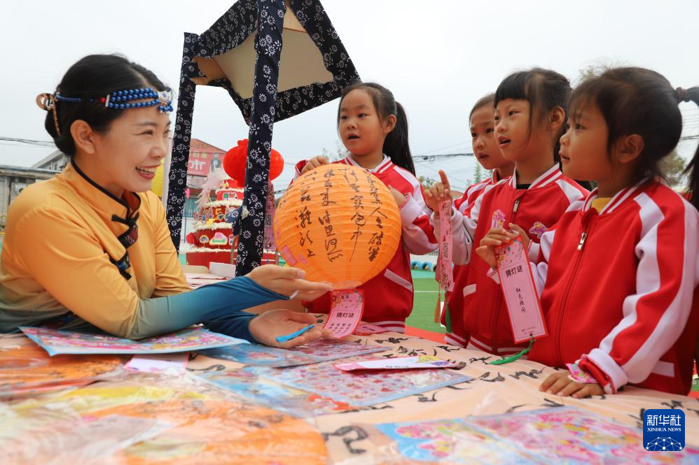 9月28日,在山東省濱州市沾化區馮家鎮李家幼兒園,孩子們在“拾趣品中秋 童心迎國慶”活動上猜燈謎。