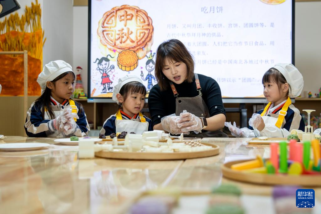 9月29日,在河南省商丘市睢縣古襄路幼兒園,小朋友們在老師的講解下學習制作冰皮月餅,了解中秋習俗。