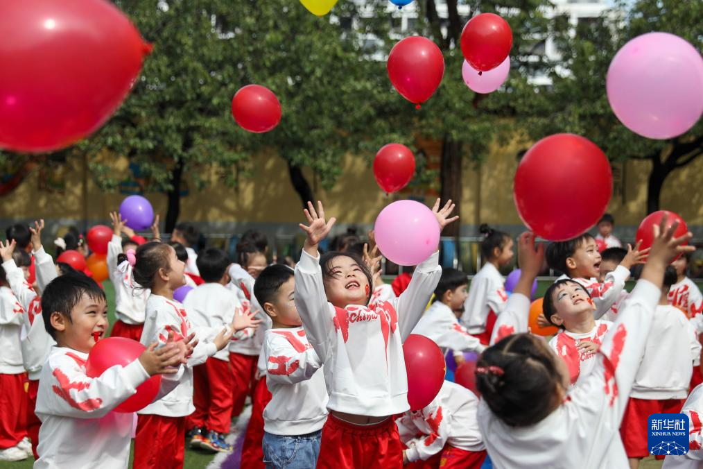 9月29日,河南省平頂山市寶豐縣鬧店鎮中心幼兒園的孩子們在放飛氣球。