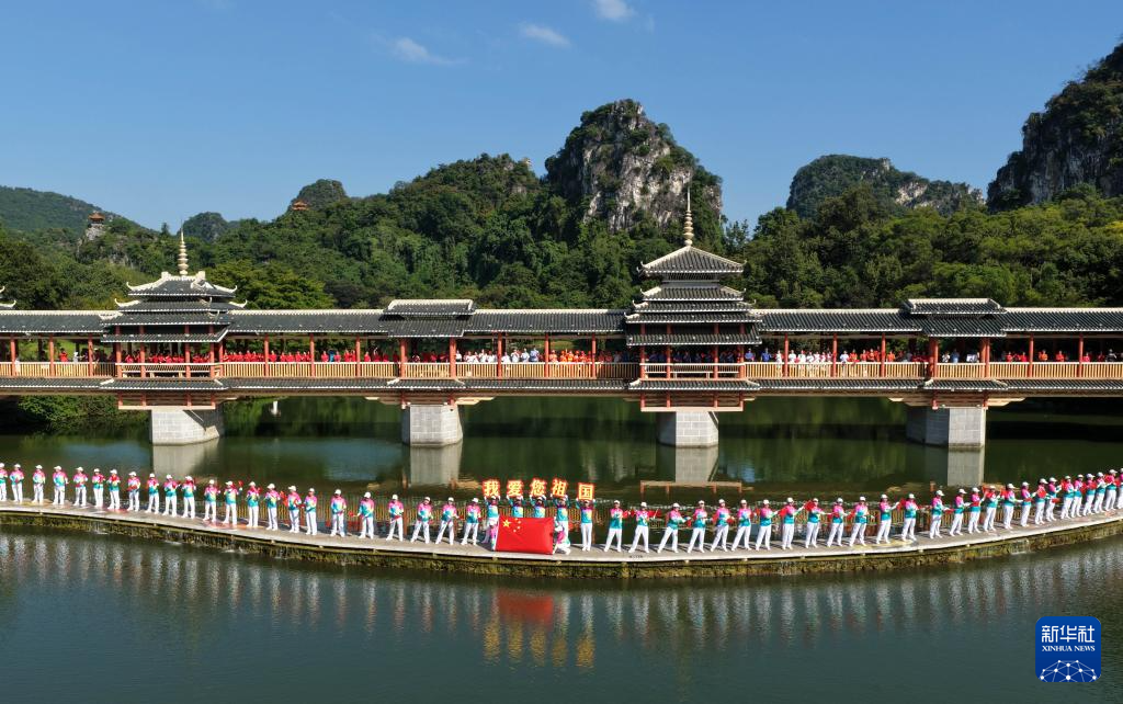 9月28日,在廣西柳州市龍潭公園,人們共同唱響《我和我的祖國》(無人機照片)。