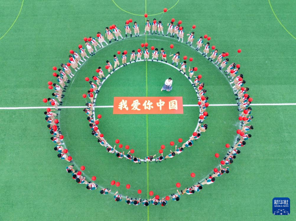 9月28日,江蘇省泰州市姜堰區東橋小學教育集團東板橋校區學生學唱愛國歌曲,迎接國慶節(無人機照片)。