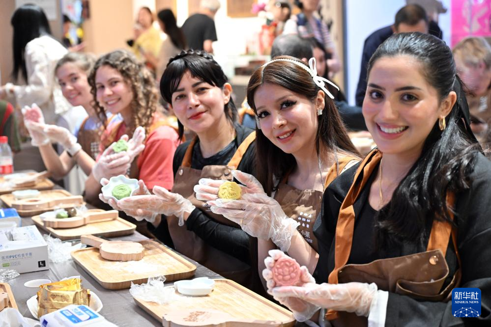 9月29日,在北京市朝陽區于小菓點心模具博物館,中外青年展示自己制作的月餅。