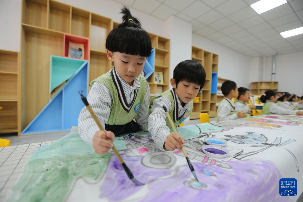 9月28日,甘肅省定西市安定區幼兒園的小朋友在繪制《我愛你中國》長卷。