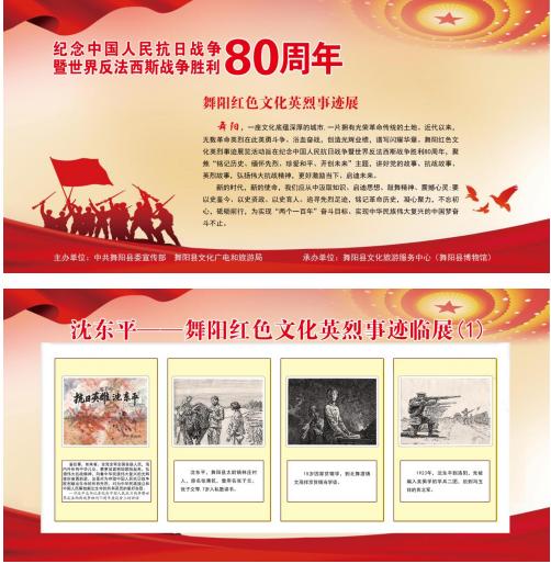 2025年8月15日,由中共舞陽縣委宣傳部、舞陽縣文化廣電和旅游局主辦,舞陽縣文化旅游服務中心(舞陽縣博物館)承辦的“紀念中國人民抗日戰爭暨世界反法西斯戰爭勝利80周年 沈東平--舞陽紅色文化英烈事跡臨展”在舞陽縣博物館黨史展廳廣場舉辦。